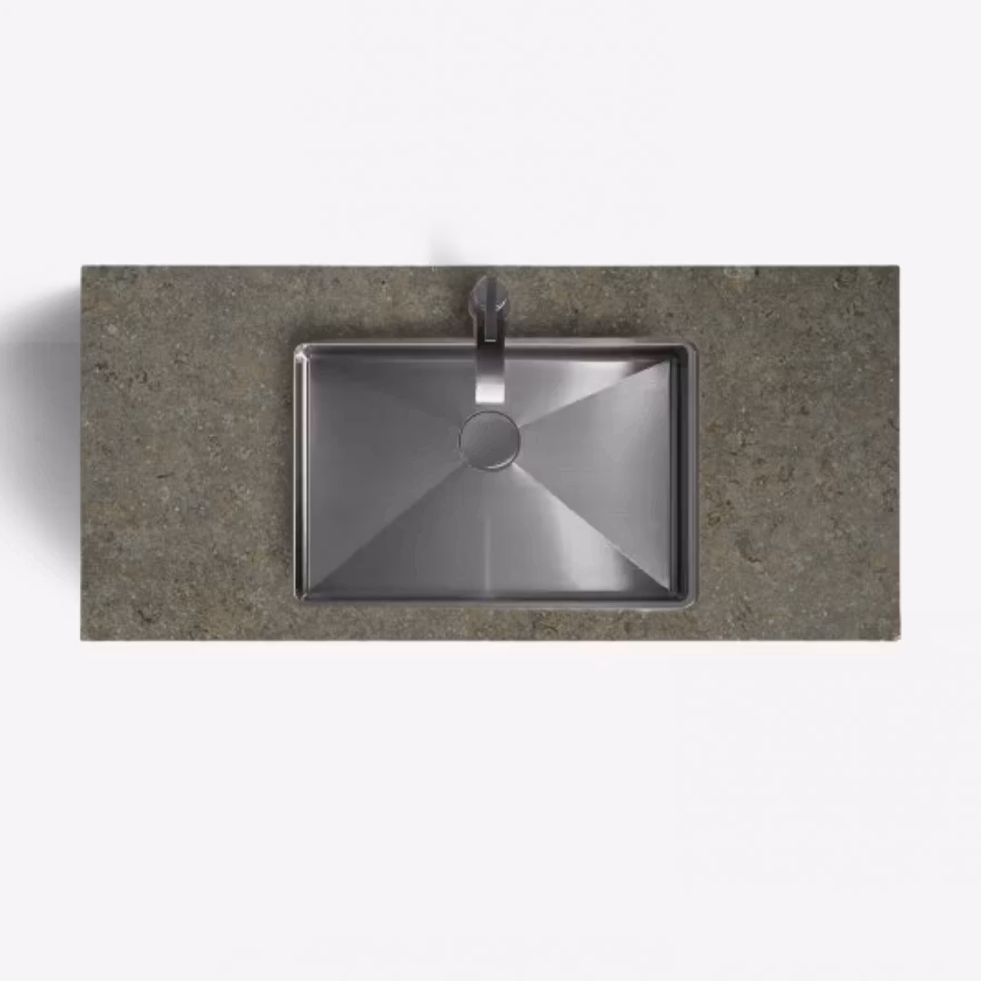 Tvättställ/handfat i Bricmate Azul Olive med seminedfällt tvättställ i rostfritt stål från Tapwell, anpassat för IKEA-kommod Ängsjön. Toppskivan är tillverkad i 12 mm granitkeramik – ett slitstarkt och helt underhållsfritt material – och levereras som standard med ett centrerat blandarhål på 35 mm.