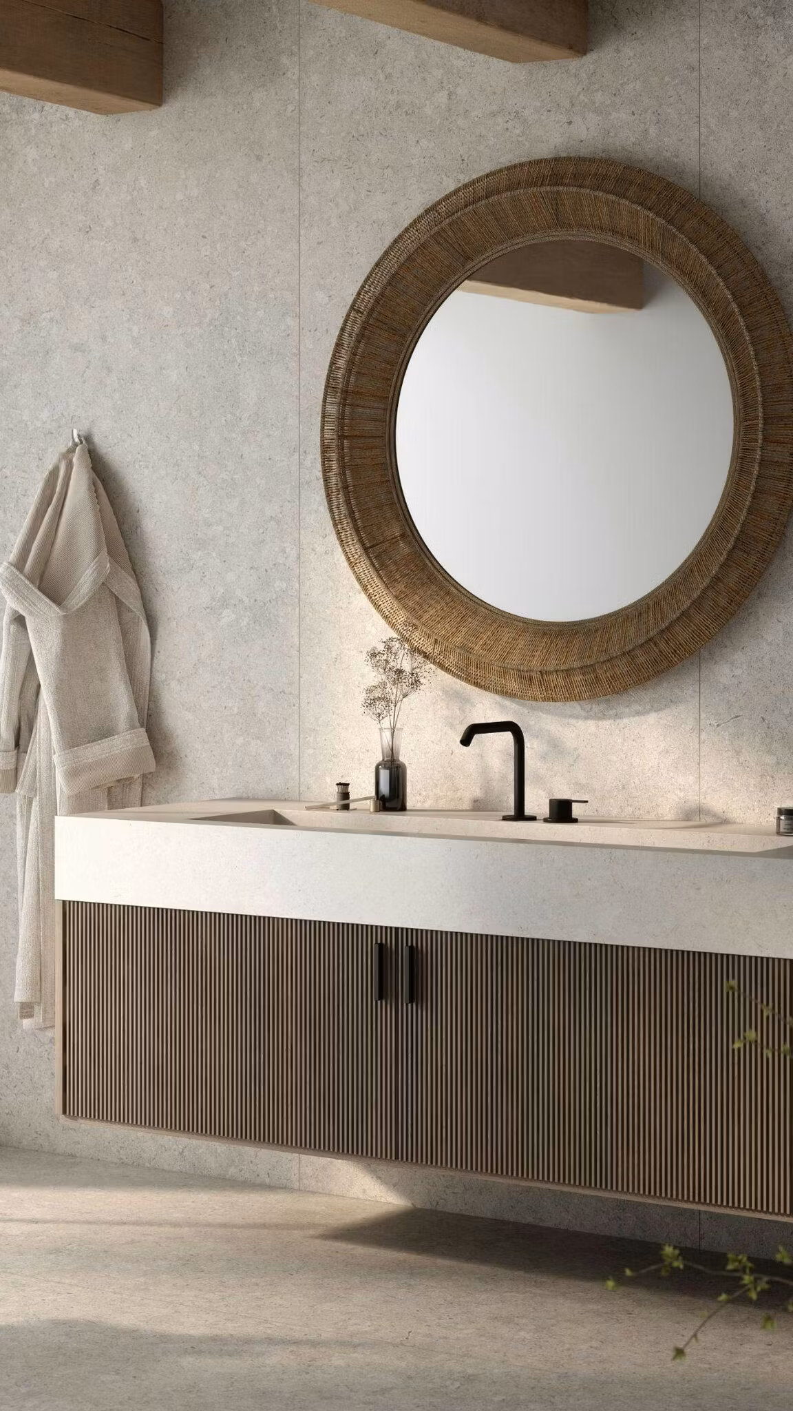 I det badrummet som du ser på bilden här ovan så är det DEKTON Grigio på både golv och vägg kombinerat med ett tvättställ i vår stora favorit Nebbia.