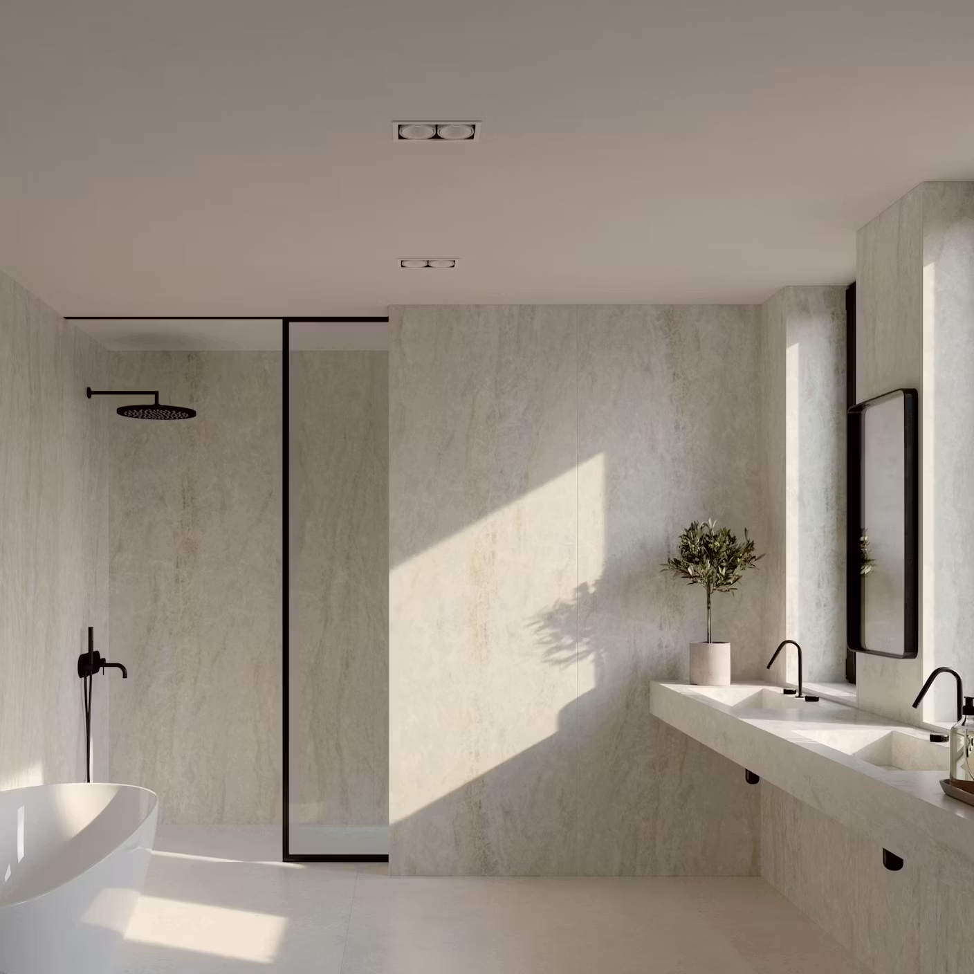Kombinera gärna DEKTON Nara med handfat i samma material för en harmonisk helhet, och välj detaljer i borstad nickel, krom eller mattsvart för att förstärka den minimalistiska känslan. Resultatet blir ett exklusivt badrum som speglar en av de största badrumstrenderna 2025 och 2026.