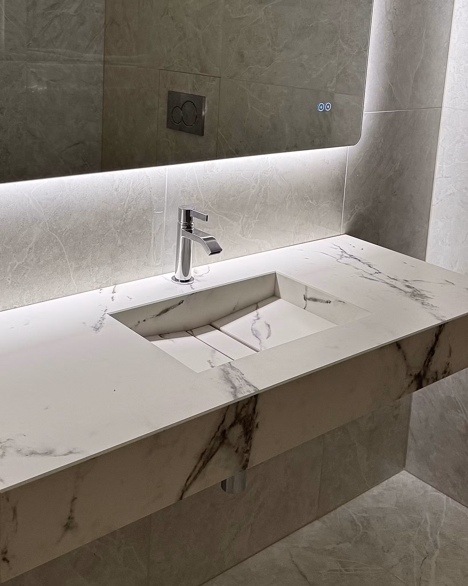 Här på bilden så ser ni DEKTON Kairos i 120cm. DEKTON Tvättställ Kairos är ett exklusivt handfat som förenar modern design med kompromisslös funktionalitet i en stilren, marmorinspirerad estetik. Tillverkat i det högpresterande materialet DEKTON erbjuder tvättstället en porfri, reptålig och lättskött yta som står emot fläckar, värme och dagligt slitage – perfekt för både privata badrum och professionella projekt.