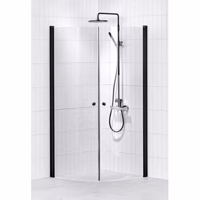 Alterna duschhörna rund med mattsvart profil. Stilren duschhörna med vändbara, svängda dörrar i klart glas. Duschhörnan är tillverkad i 6 mm härdat säkerhetsglas med blankpolerade aluminiumprofiler, knoppar i krom. Alla glas har Easy-Clean-behandlats för en smuts- och kalkavvisande yta. Enkel montering med justerbar infästning. Kan justeras +/- 10 mm per dörr. Levereras komplett med två dörrar, magnetlist, släplist, väggprofiler i aluminium och två knoppar. Kan monteras borrfritt. Duschhörnans höjd är 2000mm