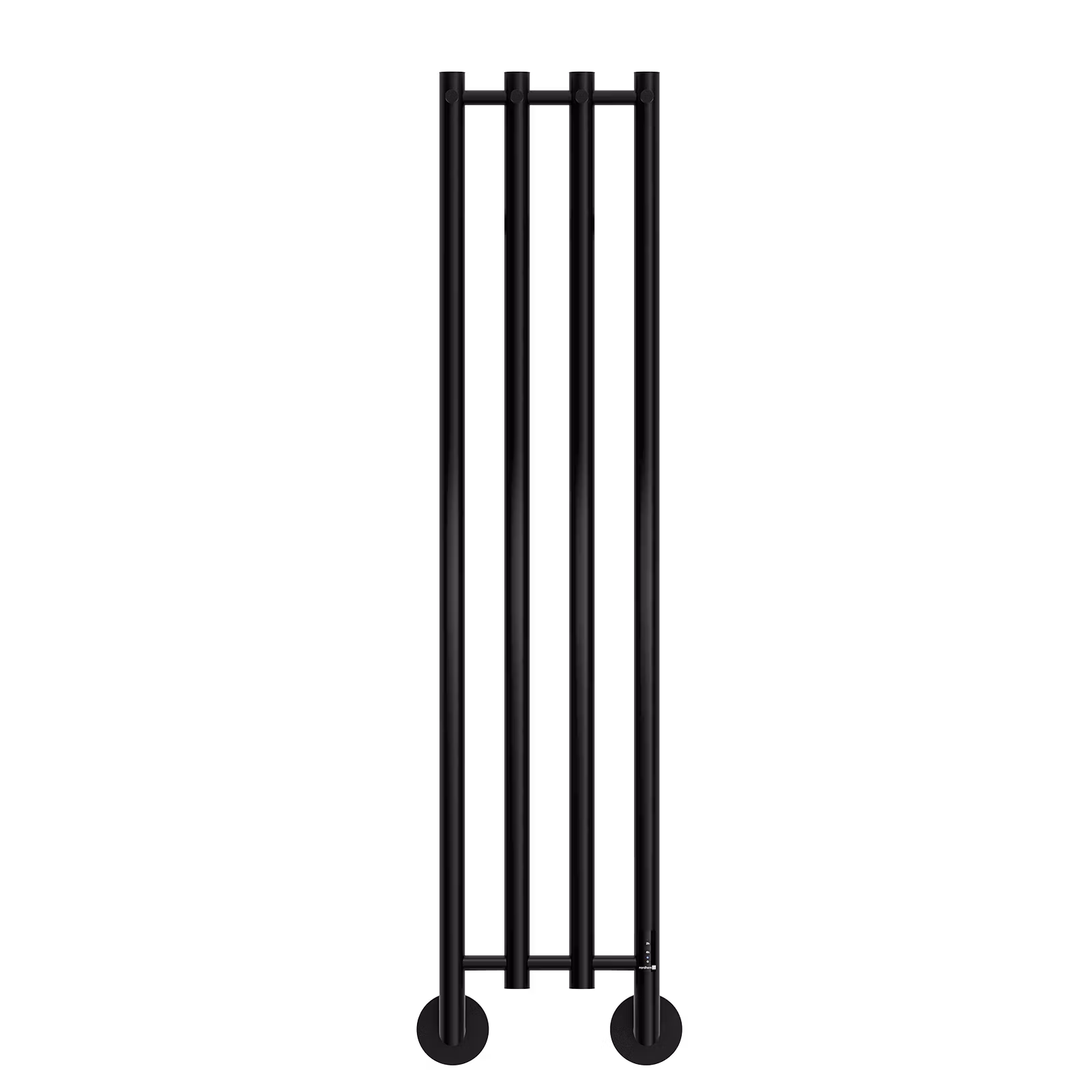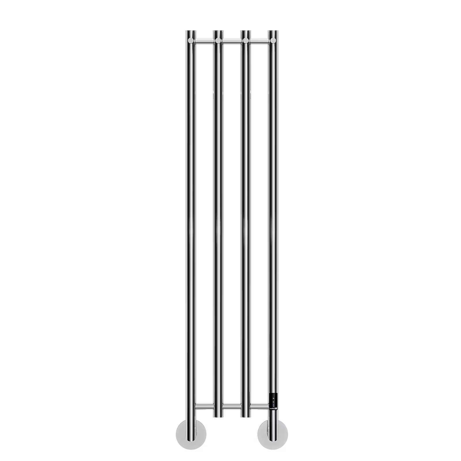 En elektrisk handdukstork i elegant och slimmat format med fyra vertikala rör och fyra krokar. Har dessutom en smart booster- och timerfunktion.