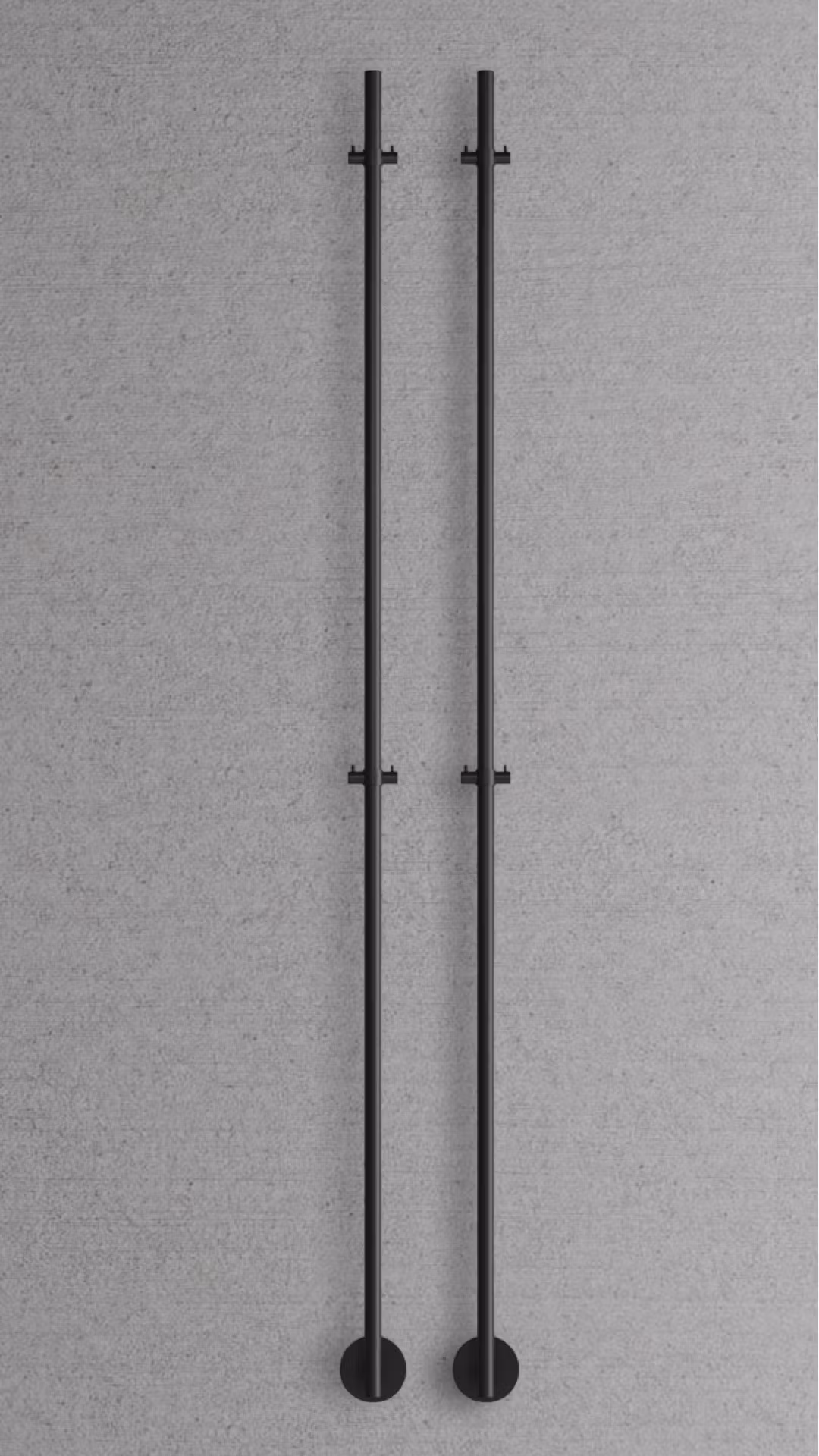 i rostfritt stål. Vertikal modell med två dubbelkrokar som kan justeras efter smak vid installationen. Utformningen är slimmad och minimalistisk med en särpräglad karaktär.