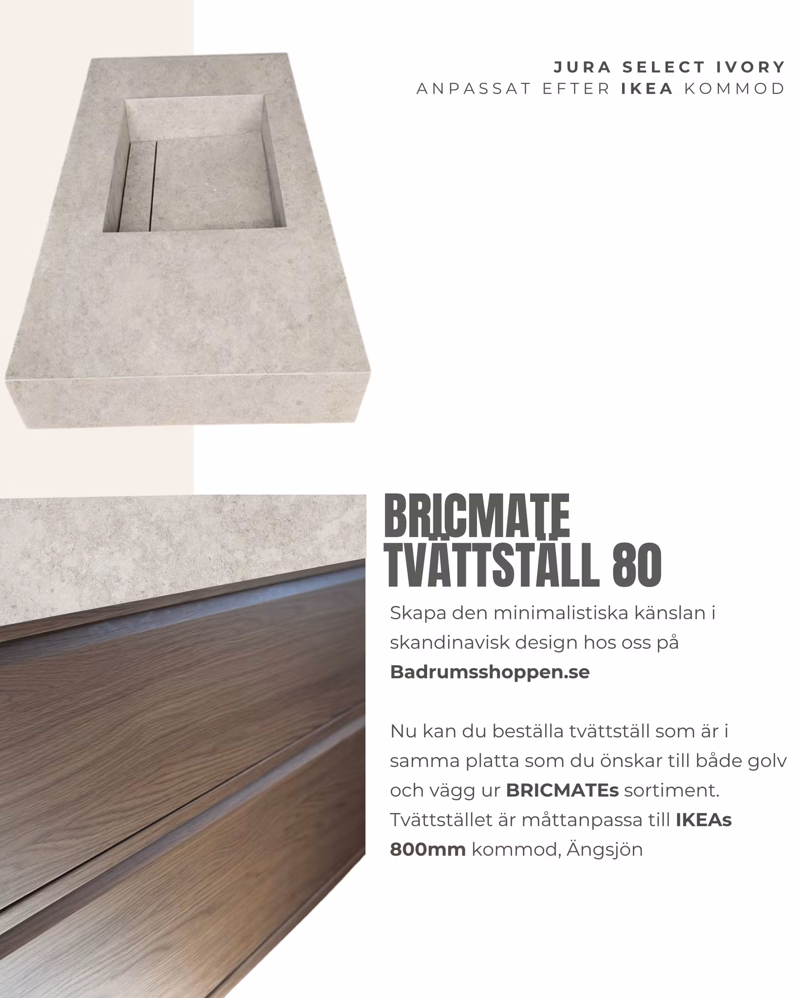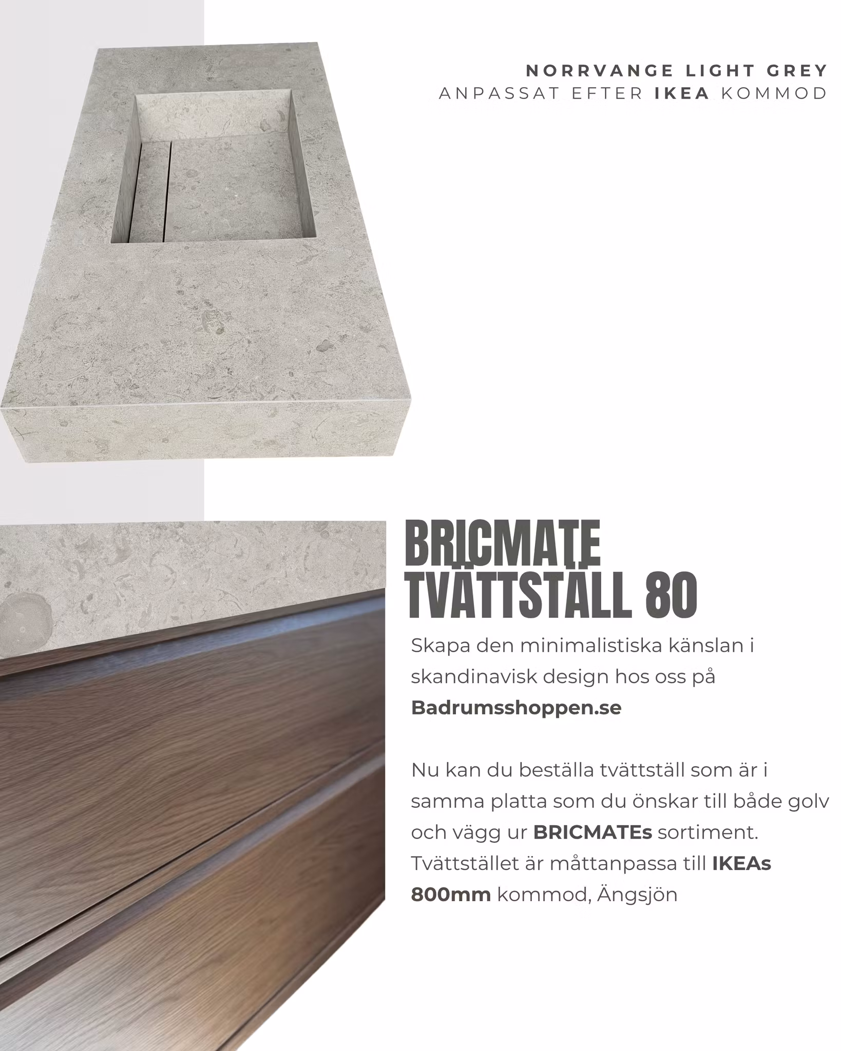Garanti & information: Vårt exklusiva tvättställ är svenskproducerat & kombinerar skandinavisk design med hög kvalitet och funktion. Tvättstället tillverkas i fukttåligt material och kläs med granitkeramikplattor från Bricmate – perfekt för dig som vill skapa en minimalistisk känsla med samma platta på golv, vägg och tvättställ. Till skillnad från många andra likvärdiga tvättställ på marknaden, där plattor endast limmas och fogas med epoxi (utan stabil grund undertill), är vårt tvättställ konstruerat som en gedigen enhet med inbyggd ho. Detta ger en robust och hållbar lösning som tål daglig användning år efter år. Alla våra tvättställ i BRICMATES sortiment har en Garantitid på 5 år. Önskar du att tvättstället måttanpassas efter din 80 kommod så kan du maila till oss på [email protected]