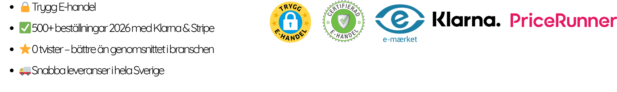 Trygga & Spårbara leveranser | Levererar till hela Sverige | 500+ leveranser 2026, 100% nöjda kunder |